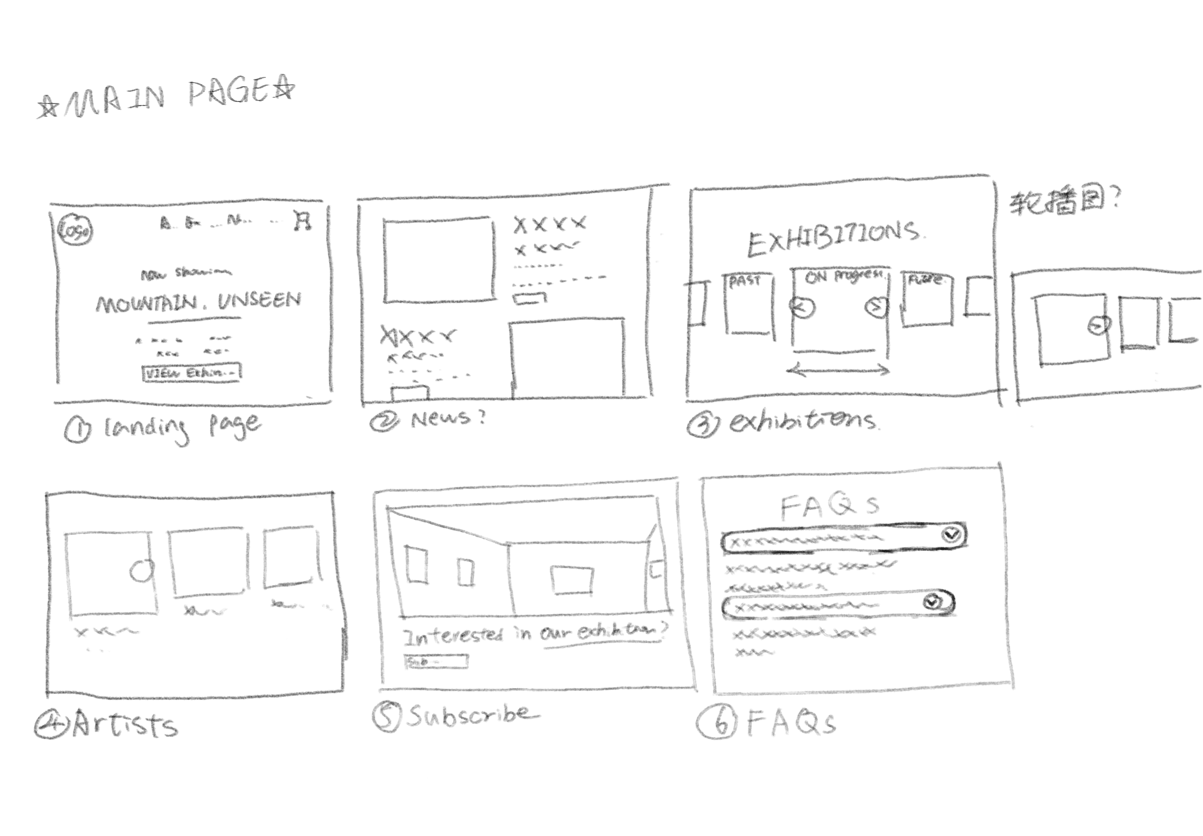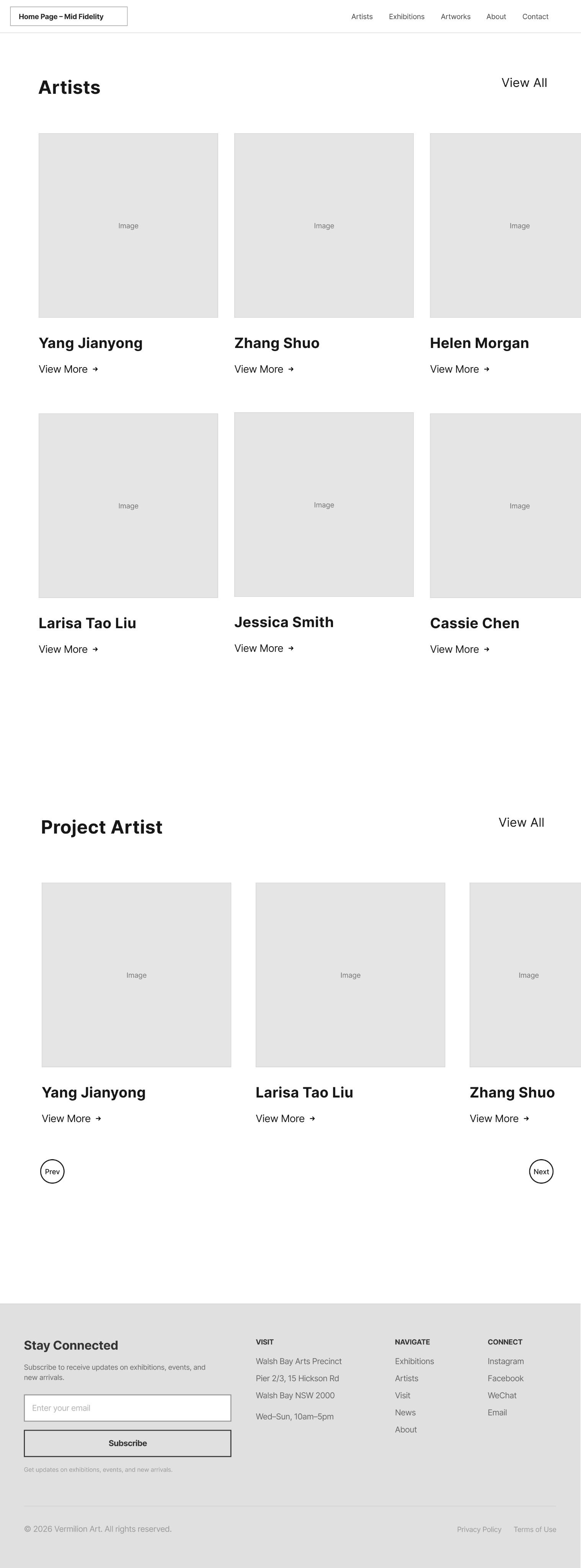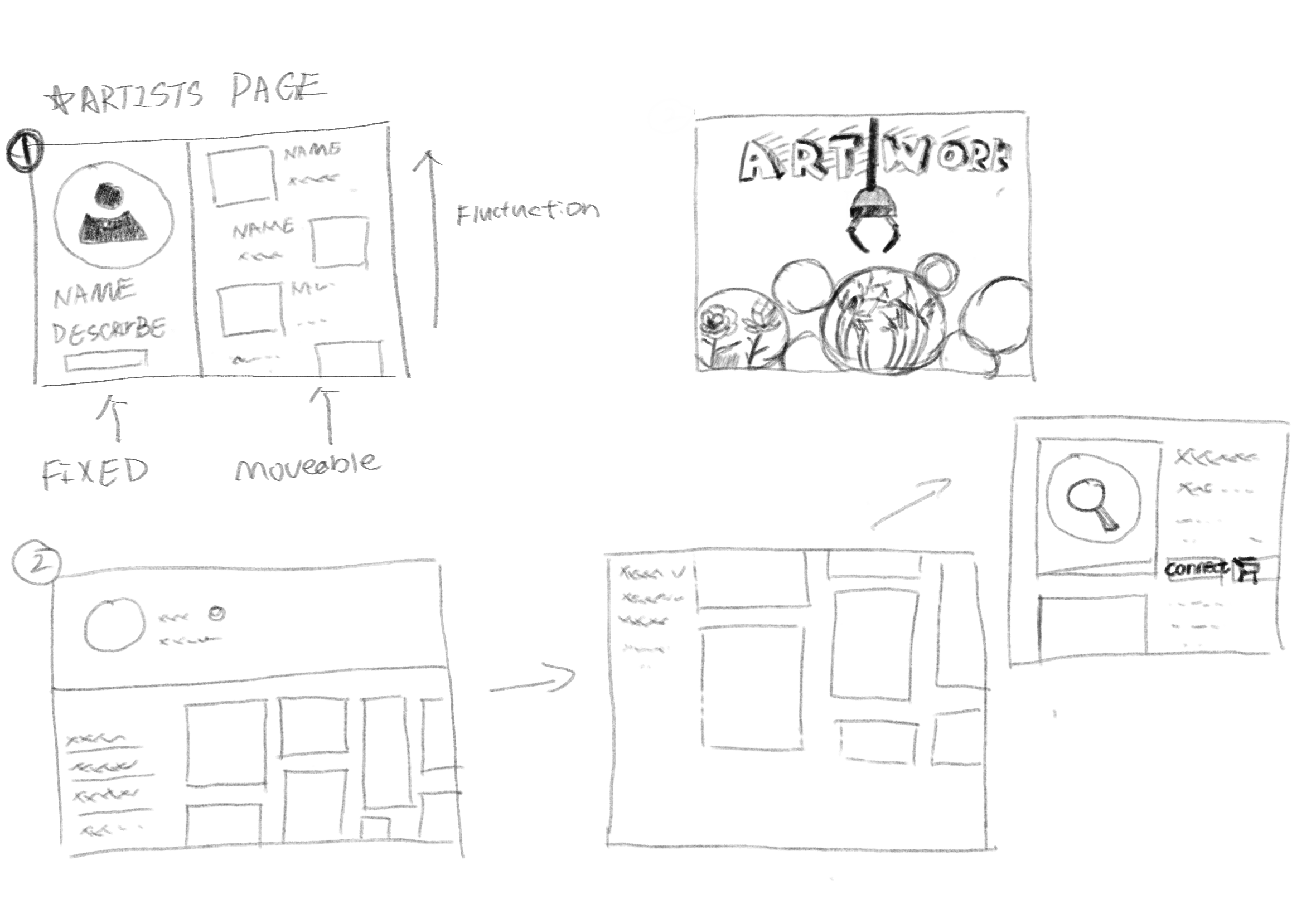 This low-fidelity prototype tested layout structure and interaction flow independently from visual styling. It maps the main page into core content sections, and explores a list-page pattern where key information/controls remain stable while the artwork area supports scanning and comparison.