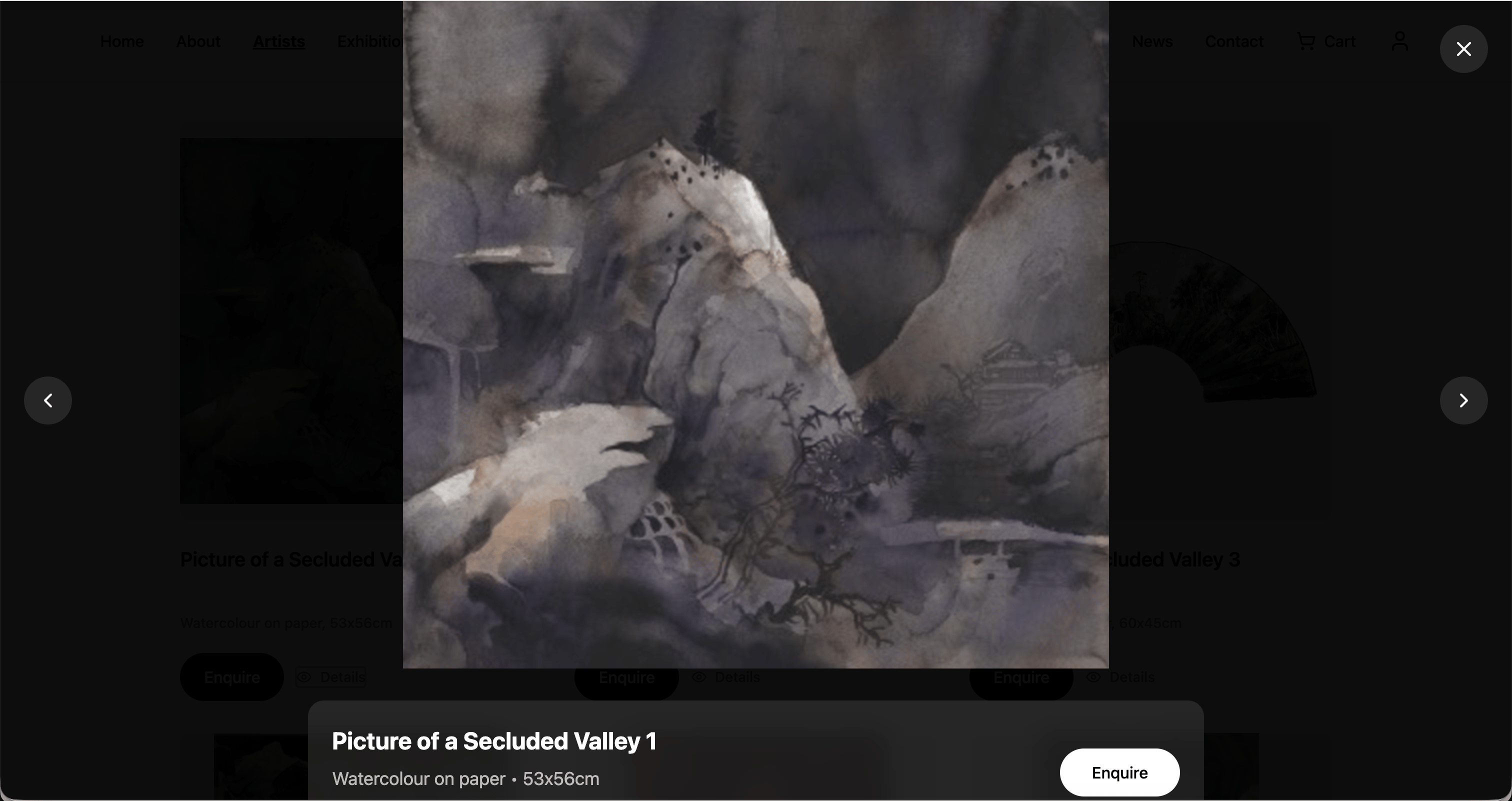Change: Introduced an eye icon on each artwork card to open an “Artwork details” quick view with a larger image, metadata, and a direct Enquire CTA.